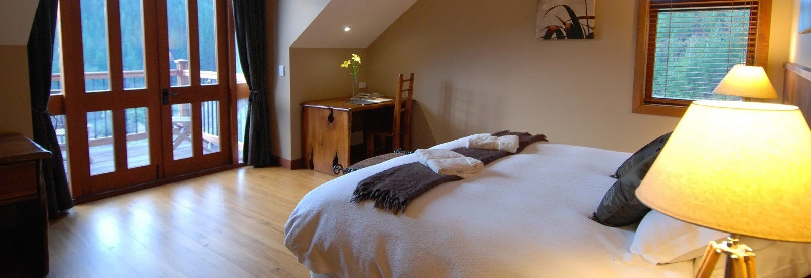 Stonefly Lodge features four beautifully appointed guest suites, each blending contemporary comfort with natural materials. Private balconies overlook the Motueka River and surrounding mountains, while premium bedding and refined furnishings create a relaxing retreat. The design balances elegance, privacy, and a deep connection to the wilderness setting.
